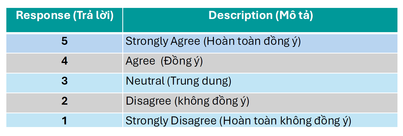 Đừng ngại phải sử dụng toàn bộ thang đánh giá, nghĩa là có thể sử dụng thang từ vị trí đánh giá thấp nhất (điểm 1), đến vị trí đánh giá cao nhất (điểm 5). Hãy cân nhắc và chọn một cách khách quan nhất. Tránh tập trung theo kiểu chỉ chọn đánh giá điểm 3 tất cả mọi câu hỏi, sẽ làm mất ý nghĩa của việc đánh giá này.