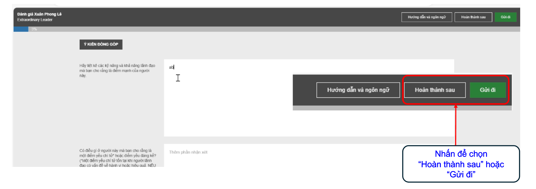 - Chọn “Hoàn thành sau” để tiến trình đánh giá được lưu lại.
