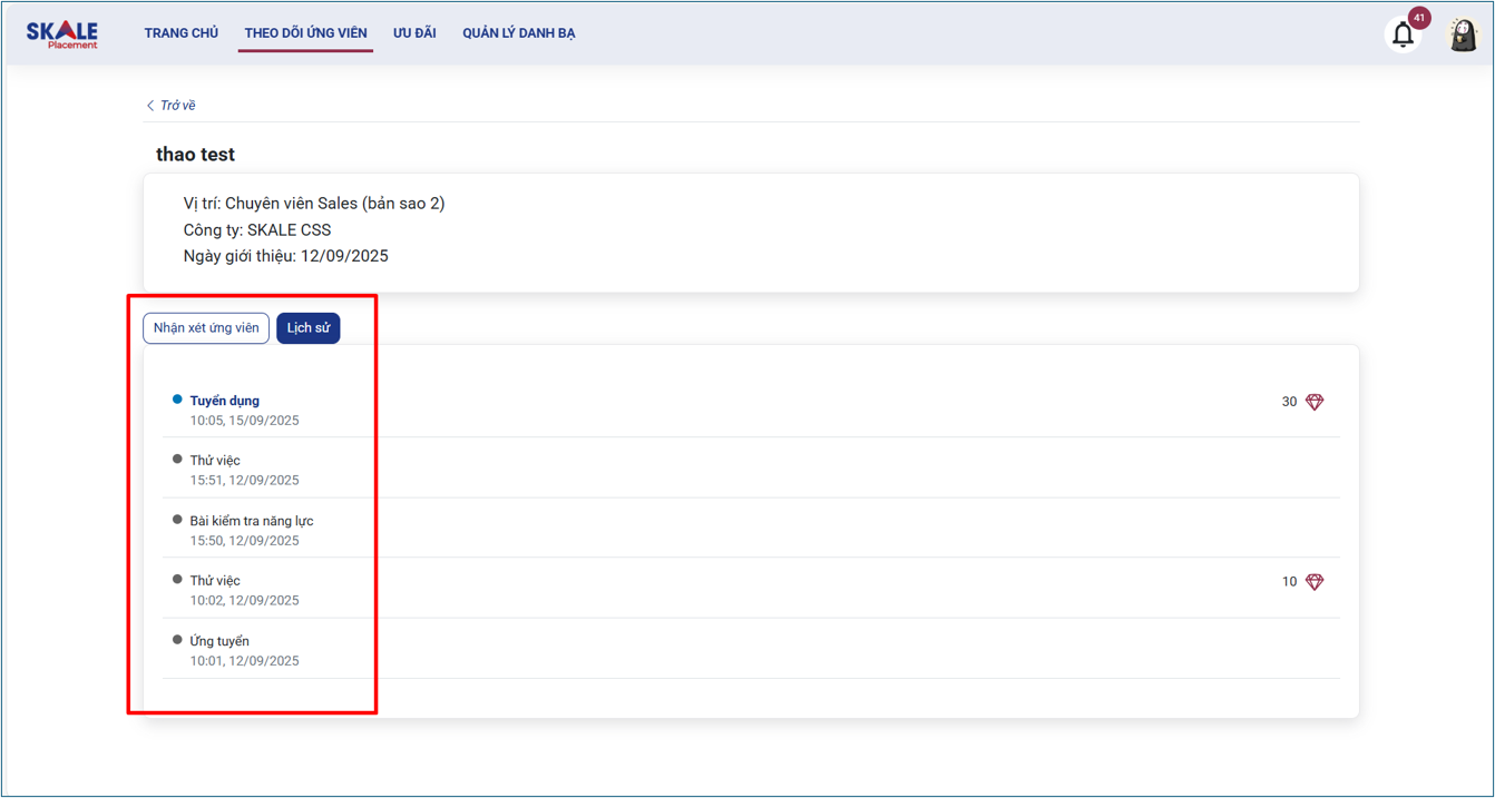- Lịch sử hiển thị tiến trình tuyển dụng chi tiết của ứng viên đã giới thiệu, liệt kê từng trạng thái (ví dụ: Ứng tuyển, Tuyển dụng) kèm theo thời gian và điểm thưởng liên quan