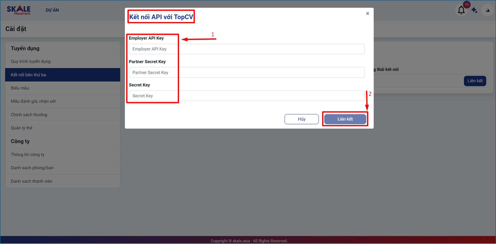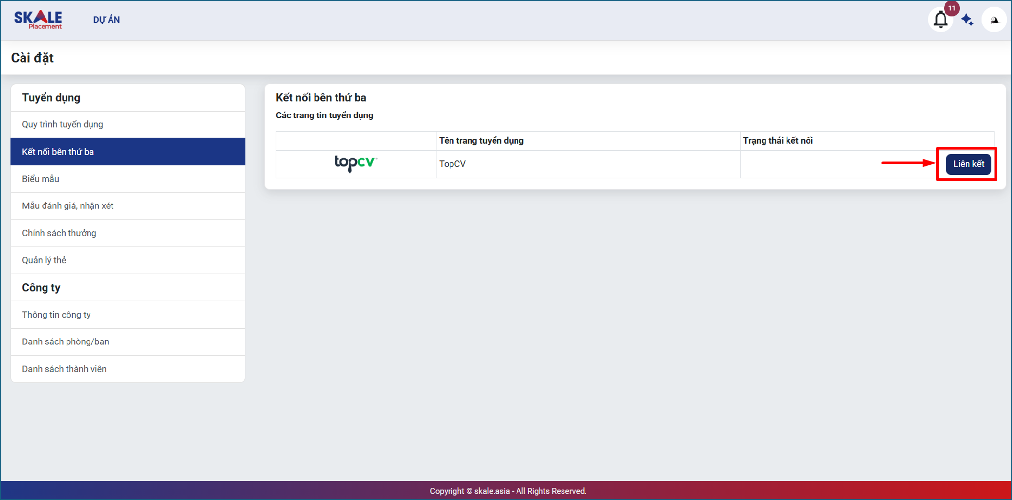 Tính năng kết nối bên thứ ba cho phép người dùng liên kết SKALE Placement với TopCV hoặc các nền tảng tuyển dụng khác nhằm chia sẻ tin tuyển dụng và đồng bộ hồ sơ ứng viên về hệ thống.