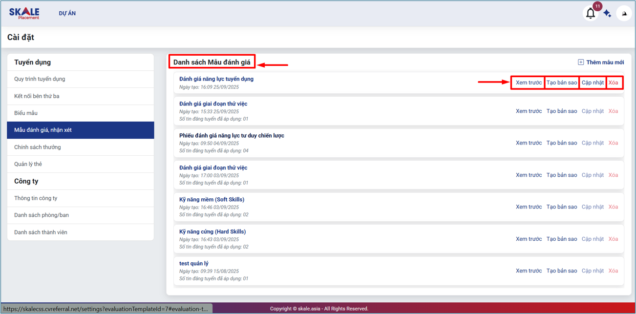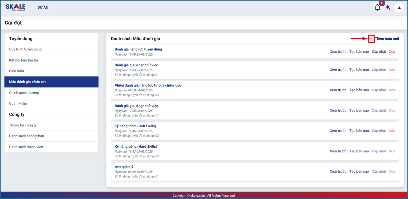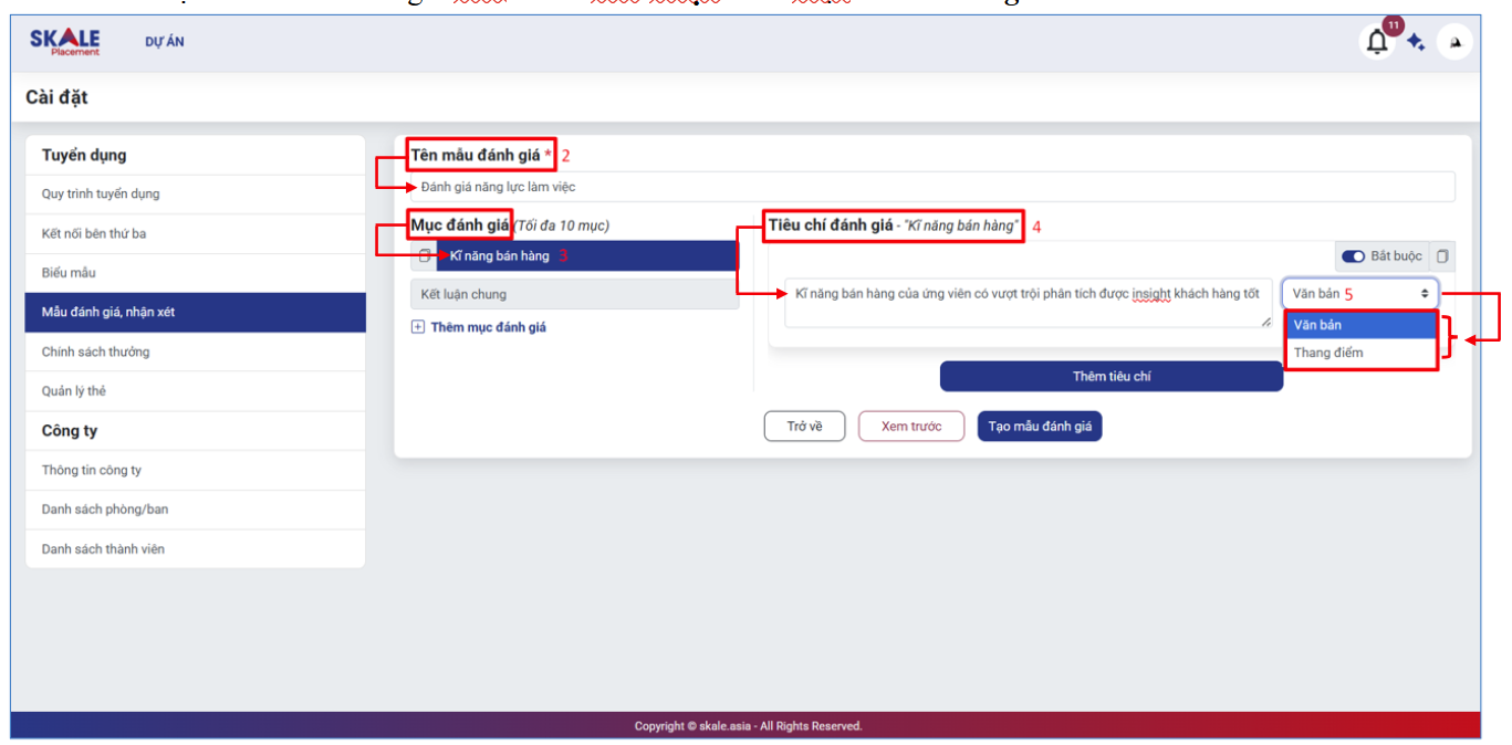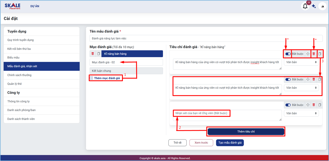 SKALE PLACEMENT: Cài đặt hệ thống _ Tạo biểu mẫu đánh giá/ nhận xét