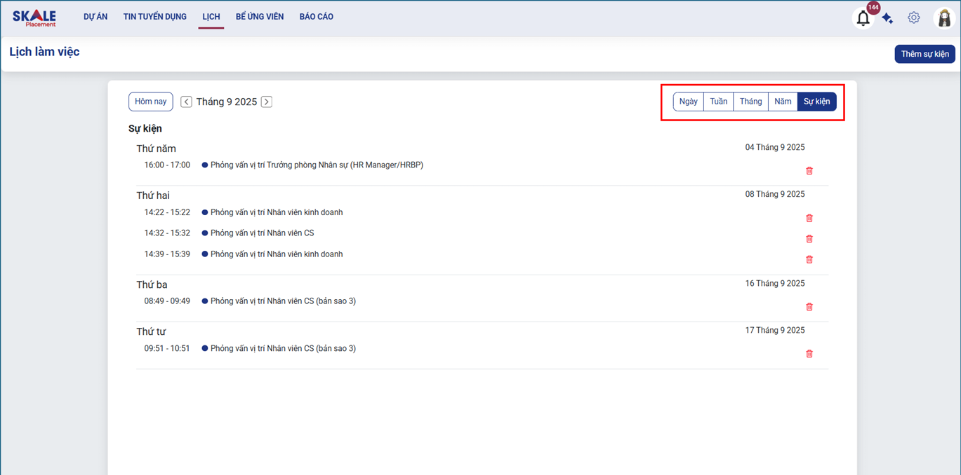 - Người dùng xem lịch phỏng vấn ứng viên theo nhiều chế độ: Ngày, Tuần, Tháng, Năm hoặc chỉ hiển thị Sự kiện.