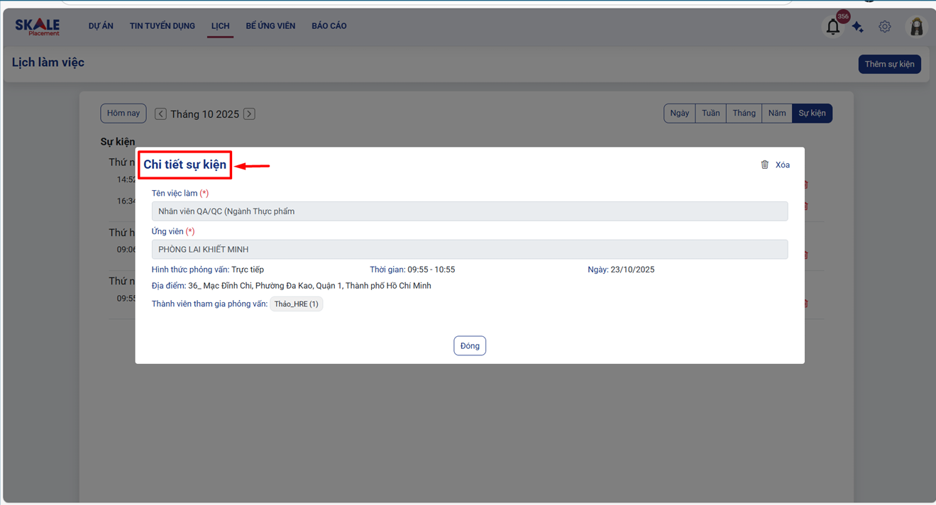- Người dùng nhấn chọn vào từng sự kiện để xem thêm thông tin chi tiết lịch phỏng vấn