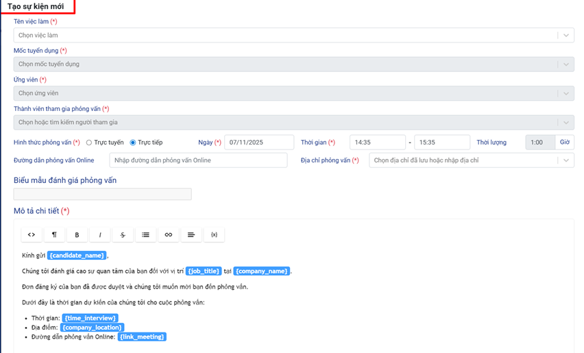 • Biểu mẫu đánh giá phỏng vấn: (Tùy chọn) Chọn một mẫu có sẵn để nhà tuyển dụng dùng làm tiêu chí đánh giá.