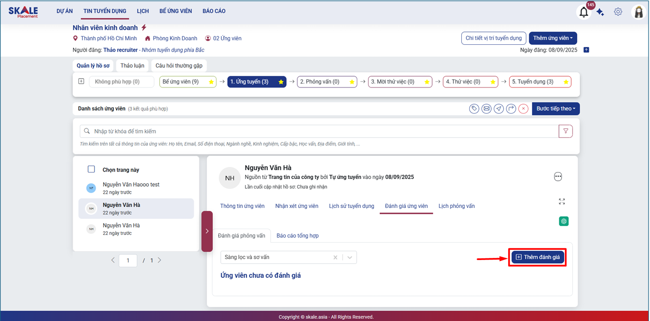 Bước 5: Nhấn “Thêm đánh giá” để mở biểu mẫu đánh giá ứng viên