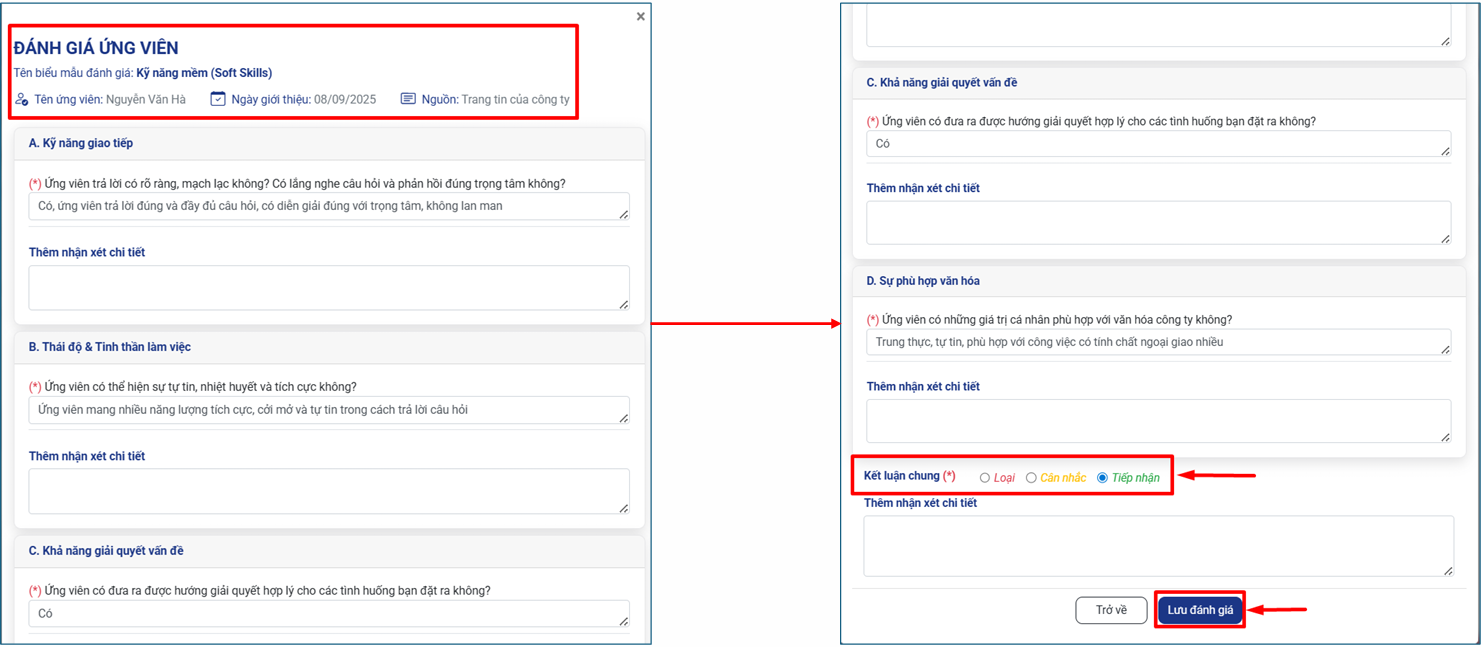 Bước 6: Nhà tuyển dụng nhập đánh giá ứng viên vào biểu mẫu và kết luận ứng viên theo 3 mức độ “Loại”, “Cân nhắc”, “Tiếp nhận”