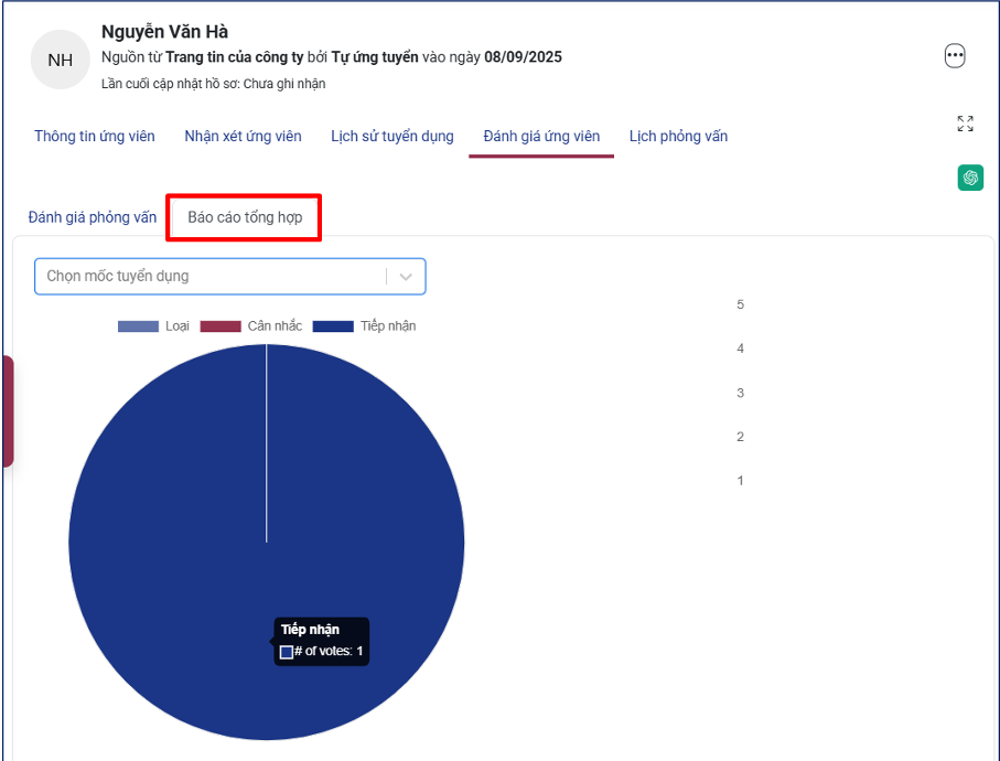 "Đánh giá ứng viên cho phép đánh giá và nhận xét ứng viên theo biểu mẫu từng mốc tuyển dụng. Người dùng nhập nhận xét, kết luận và lưu kết quả để theo dõi và tổng hợp báo cáo."