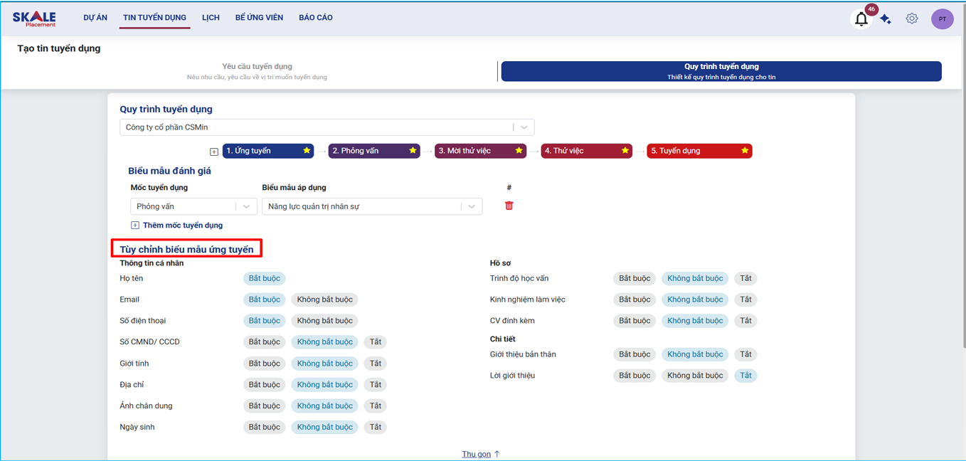 Bước 6: Tùy chỉnh thông tin bắt buộc trong "Biểu mẫu" ứng tuyển