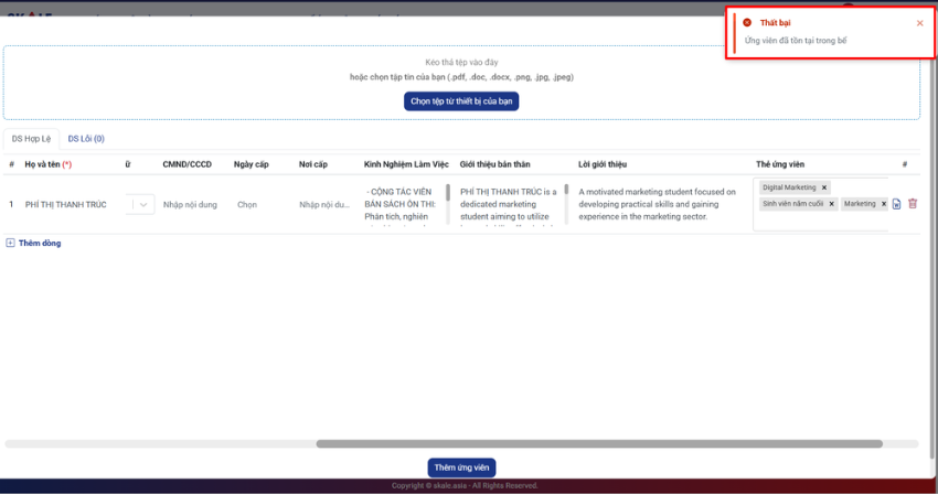 Bước 1: Người dùng thêm hồ sơ (thủ công hoặc tải nhiều CV) trong chi tiết tin tuyển dụng, hệ thống tự động kiểm tra và nhảy cảnh báo trùng đối với hồ sơ đã tồn tại trong bể