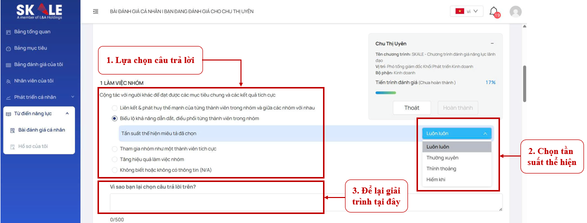 Bước 3: Bài đánh giá năng lực sẽ hiển thị dưới dạng các câu hỏi trắc nghiệm, bạn hãy chọn câu miêu tả đúng với hành vi/năng lực của bản thân trong công việc, chọn tần suất thực hiện (nếu có) và để lại giải trình ở mỗi đáp án/lựa chọn (nếu có).