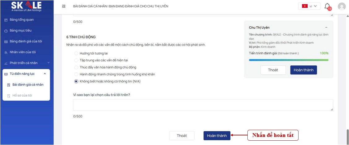 Bước 4: Khi đã chọn xong các miêu tả đúng với hành vi/năng lực của mình, bạn hãy kiểm tra lại các đáp án thêm một lần nữa trước khi nhấn chọn “Hoàn thành” để kết thúc việc tự đánh giá năng lực.