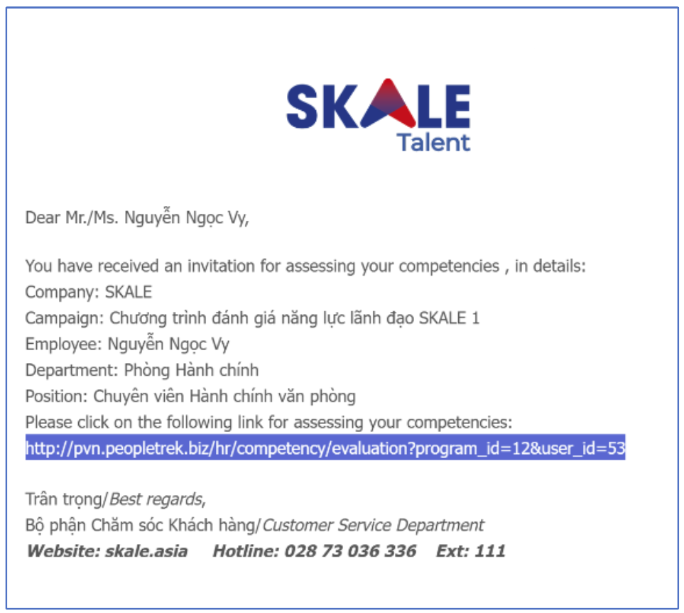 Khi chương trình đánh giá được kích hoạt, Người tham gia sẽ nhận được email mời tham gia chương trình đánh giá năng lực từ hệ thống SKALE Talent như hình dưới đây.
