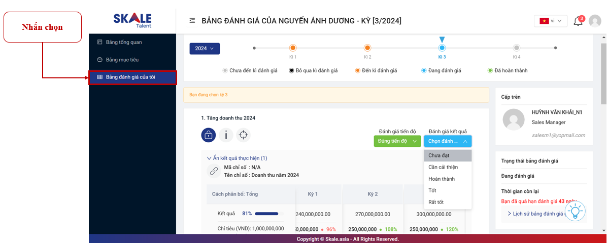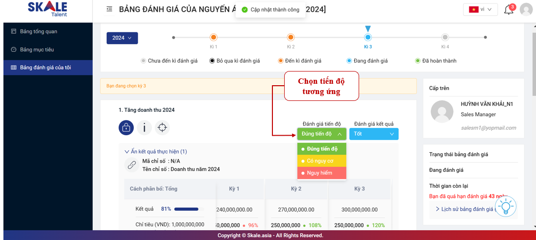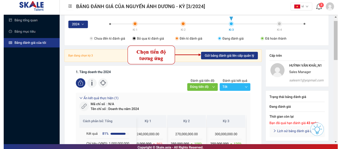 Sau khi nhập kết quả của toàn bộ mục tiêu, bạn có thể tự đánh giá tiến độ và kết quả thực hiện của mình trên từng mục tiêu. Dựa trên kết quả này, Quản lý sẽ xem xét và đưa ra đánh giá cuối cùng cho bạn vào cuối mỗi kỳ.
