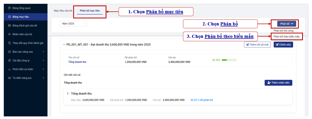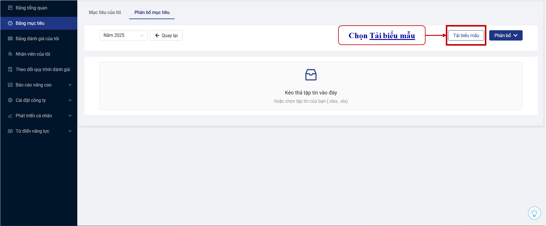 "Phân bổ mục tiêu bằng biểu mẫu cho phép quản lý phân bổ mục tiêu cho nhiều nhân viên cùng lúc thông qua file biểu mẫu, giúp tiết kiệm thời gian nhập liệu và đảm bảo việc giao mục tiêu được thực hiện nhanh chóng, đồng bộ và nhất quán."
