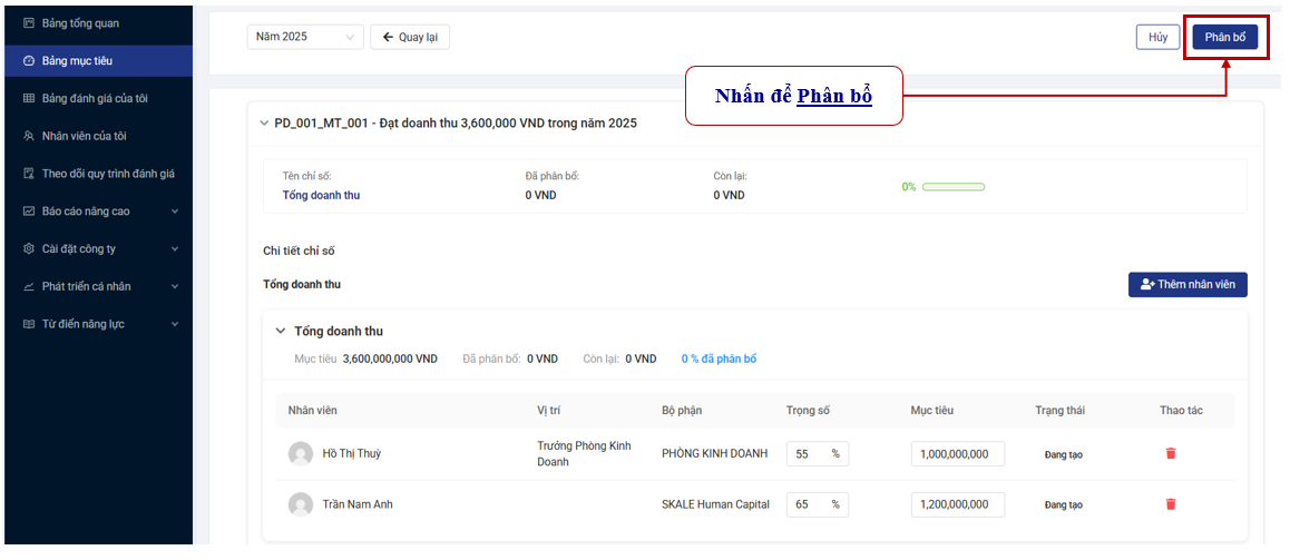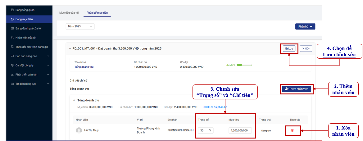 Tại đây, Quản lý trực tiếp có thể chỉnh sửa Trọng số, Chỉ tiêu, Thêm nhân viên và Xóa nhân viên đã phân bổ. Sau đó, nhấn nút “Lưu” để lưu các thay đổi của phần phân bổ mục tiêu này.