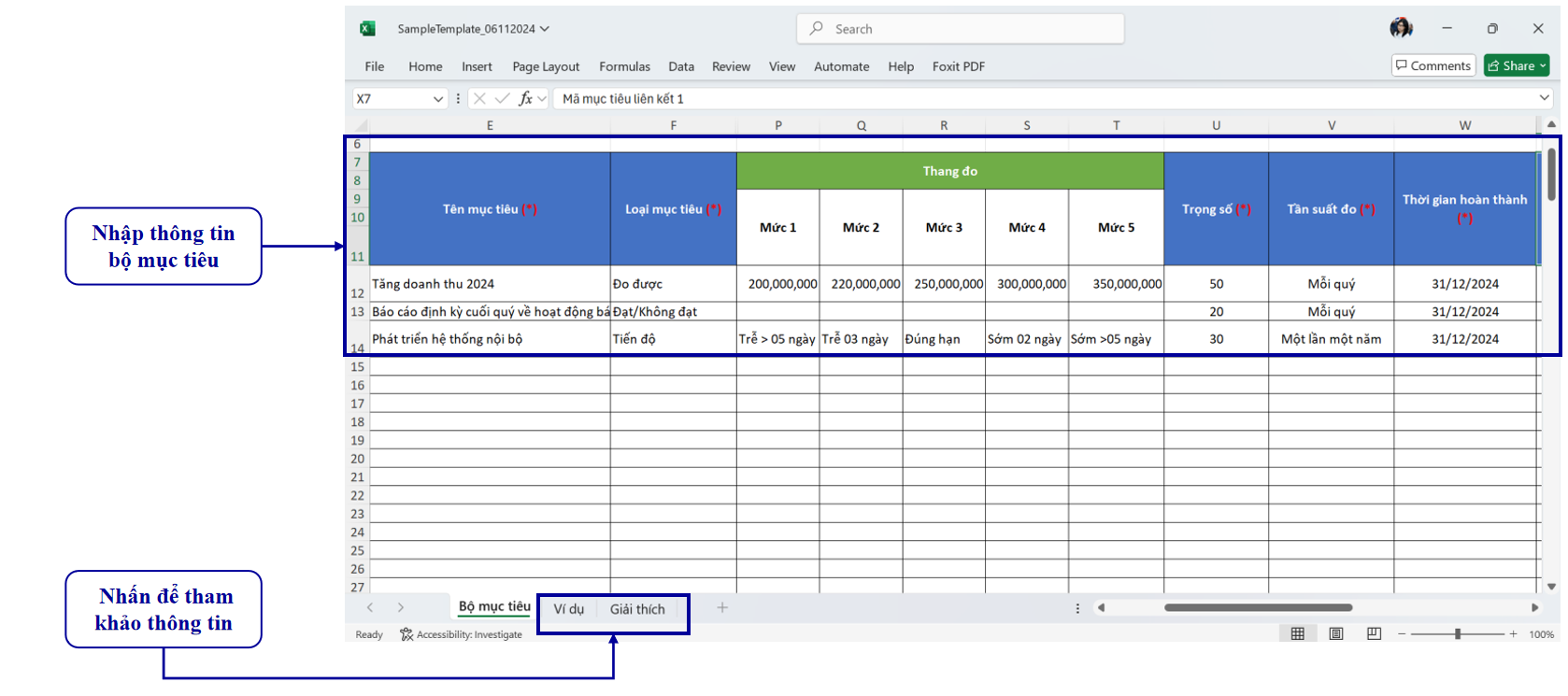 - Điền các thông tin bắt buộc (*) trên Excel như: Tên mục tiêu, loại mục tiêu, trọng số,…