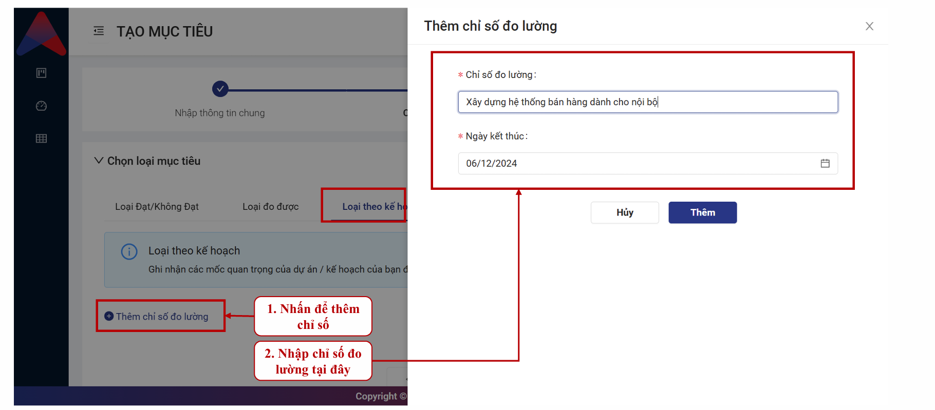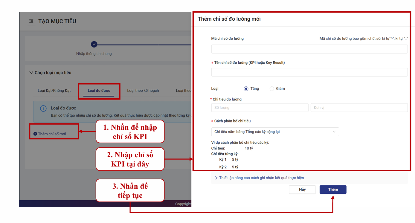 - Sau khi nhập xong thông tin chung của mục tiêu, bạn cần xác định loại mục tiêu của mình và nhập chỉ số KPI/đo lường tương ứng.