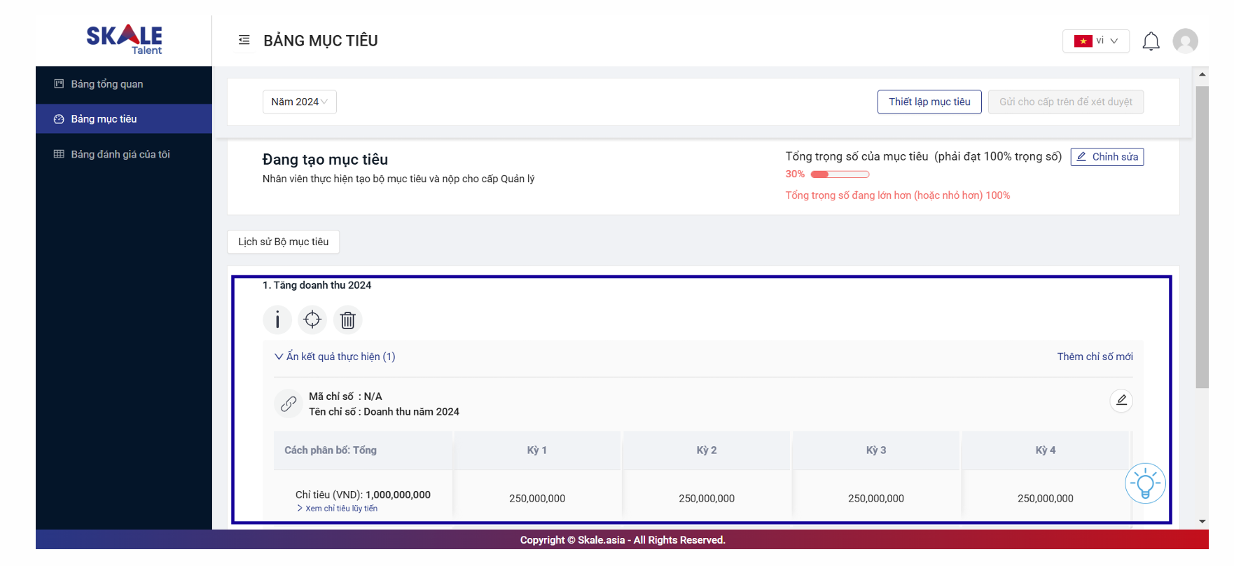 Ví dụ: Tiêu chí hoành thành của mục tiêu loại đo được “Tăng doanh thu năm 2024” với chỉ số KPI là 250,000,000VND/quý.