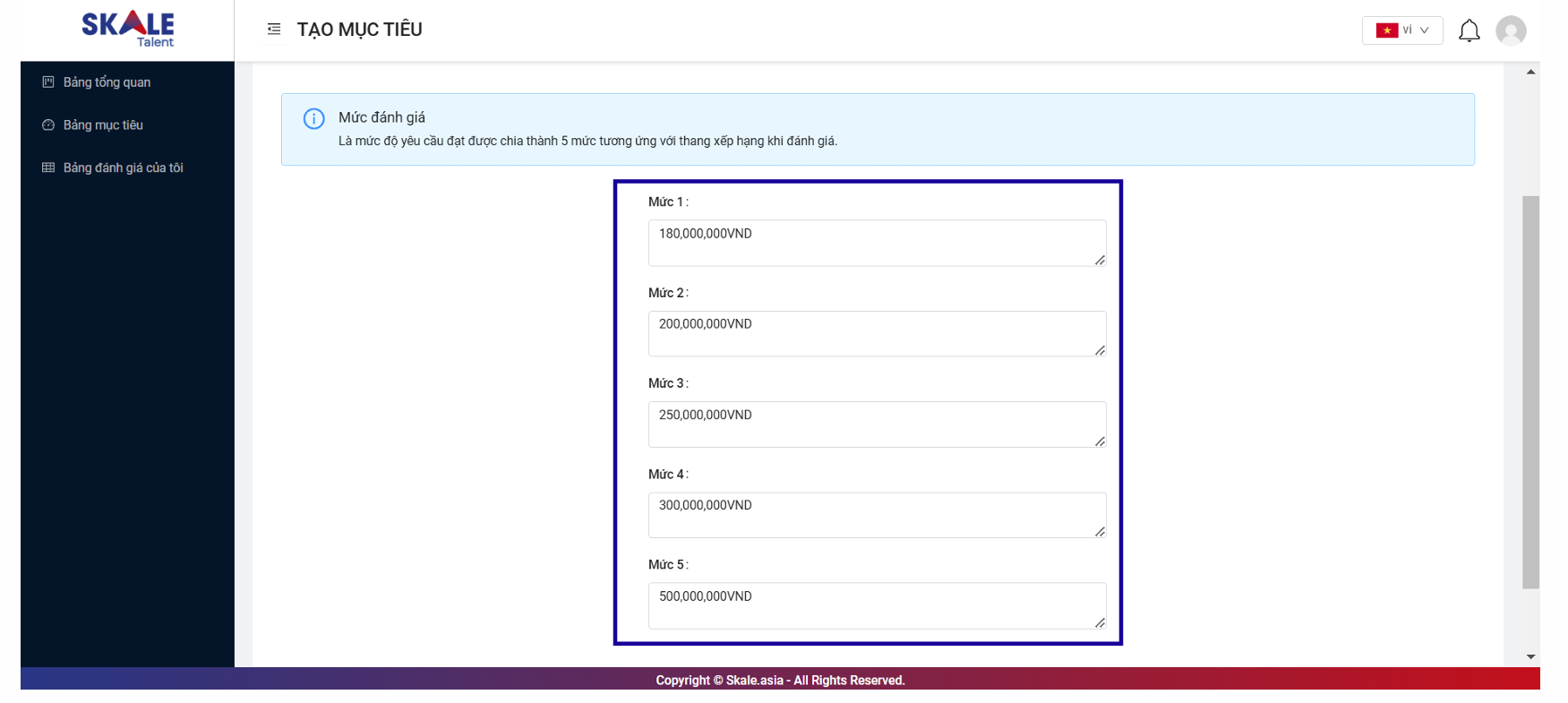 - Sau khi hoàn tất chọn loại mục tiêu và nhập chỉ số , bạn cần nhập các mức tiêu chí đánh giá tương ứng với thang xếp hạng của mục tiêu này.