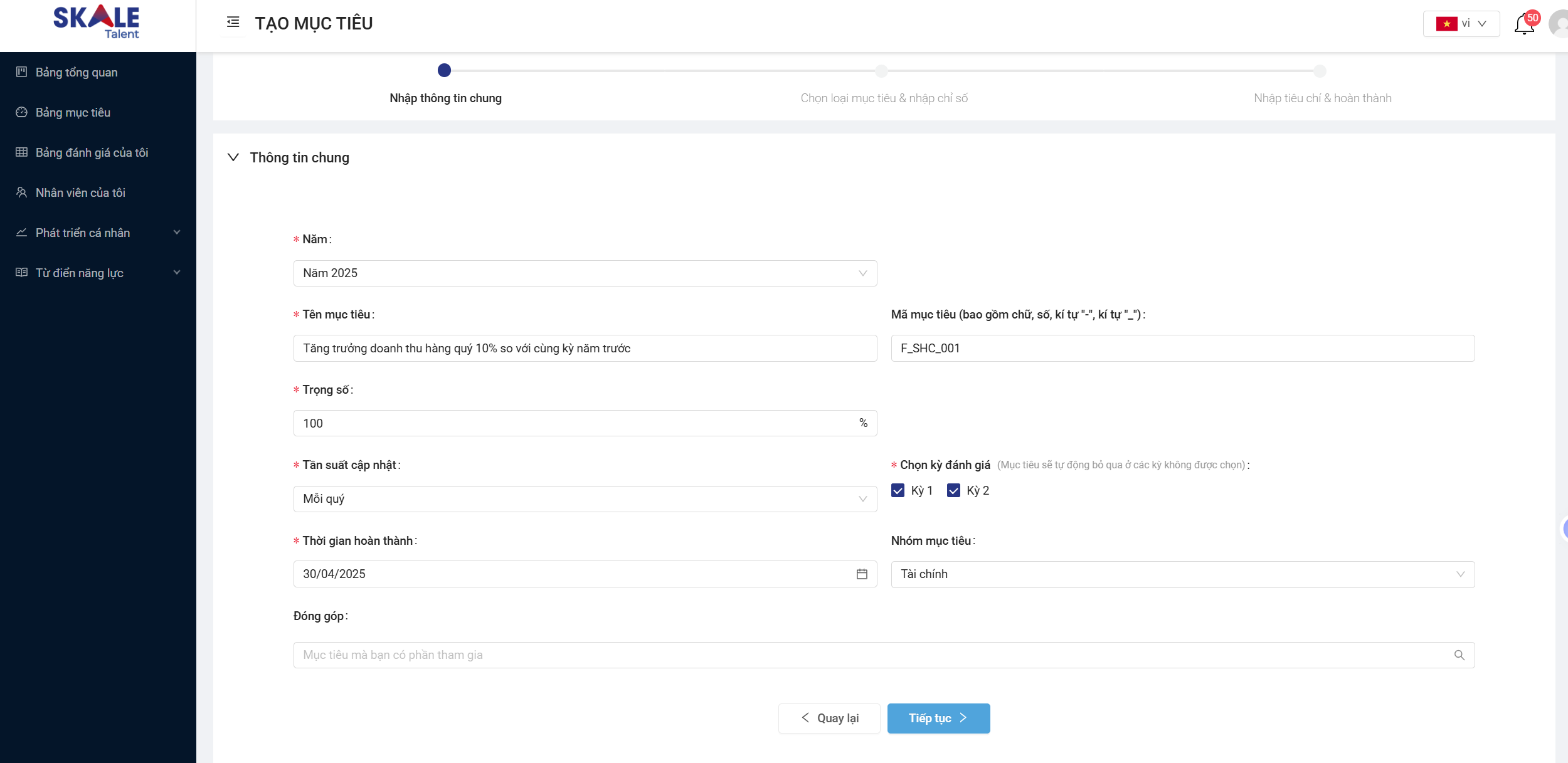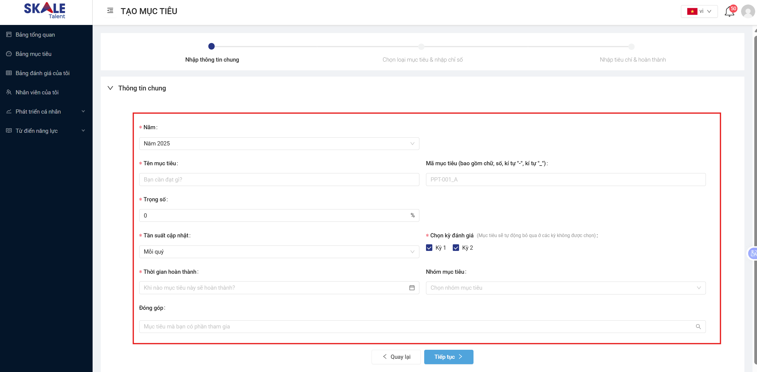 Dựa vào bộ mục tiêu nhận được từ Quản lý của mình, bạn hãy tiến hành nhập thông tin chung của từng mục tiêu lên hệ thống: