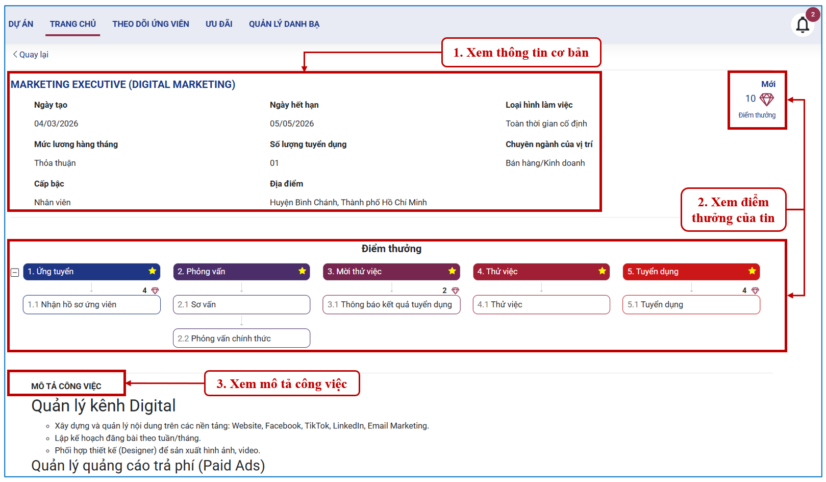 1. Xem thông tin cơ bản của tin gồm: ngày tạo, ngày hết hạn, mức lương, số lượng tuyển, cấp bậc, địa điểm, loại hình làm việc và chuyên ngành.