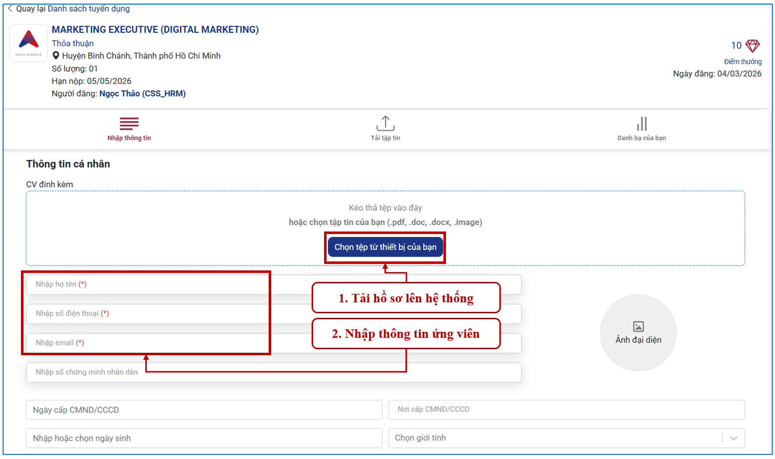 - Nhấn “Chọn tệp từ thiết bị của bạn” để upload CV (định dạng: .pdf, .doc, .docx, image)