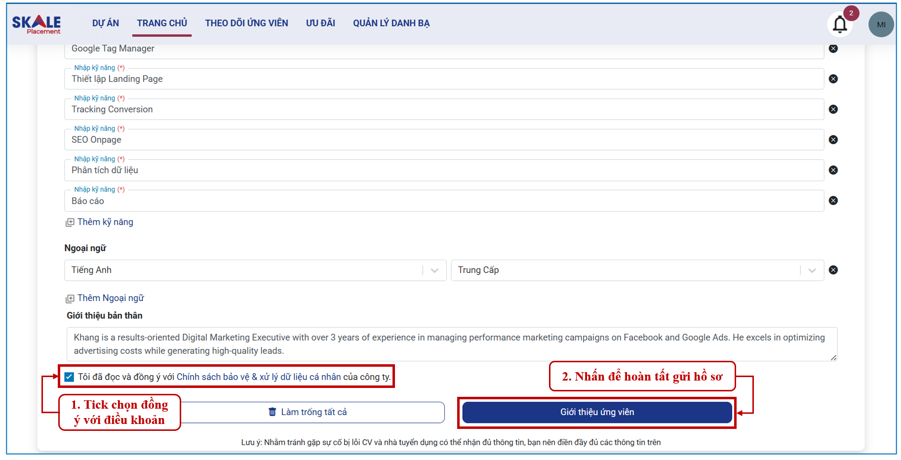 Bước 5: Tick chọn đồng ý điều khoản và hoàn tất giới thiệu ứng viên