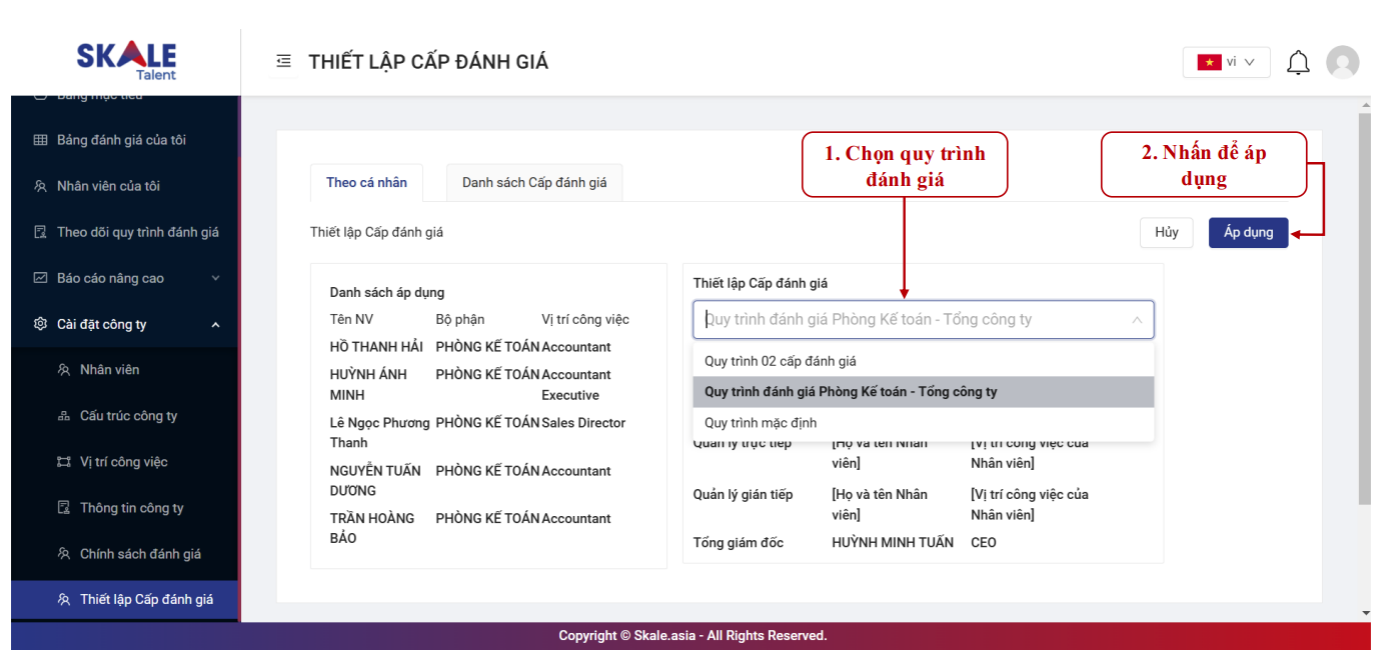 Ví dụ: Thiết lập quy trình nhiều cấp đánh giá, tương ứng Nhân viên sẽ được đánh giá bởi Quản lý trực tiếp và được duyệt kết quả đánh giá bởi các cấp Quản lý gián tiếp đã thiết lập.
