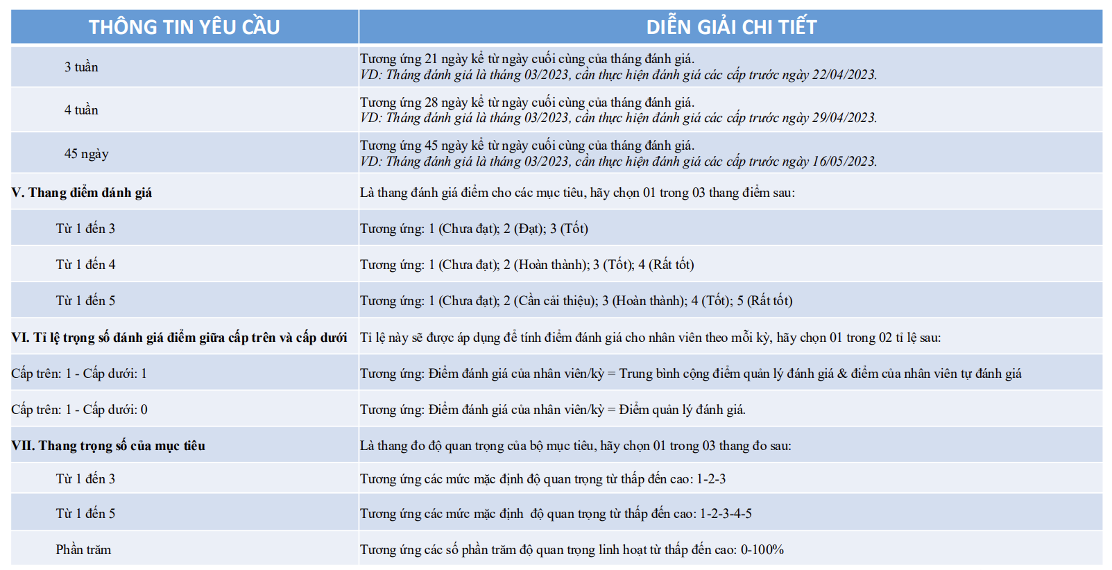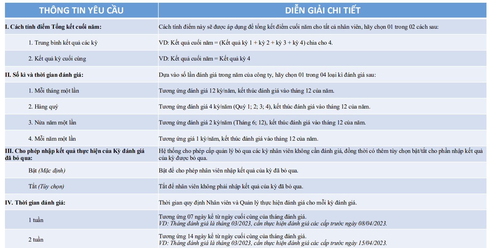 Quản lý Nhân sự thiết lập kỳ đánh giá với các nội dung được yêu cầu, hãy xem diễn giải cụ thể ở trang tiếp theo.