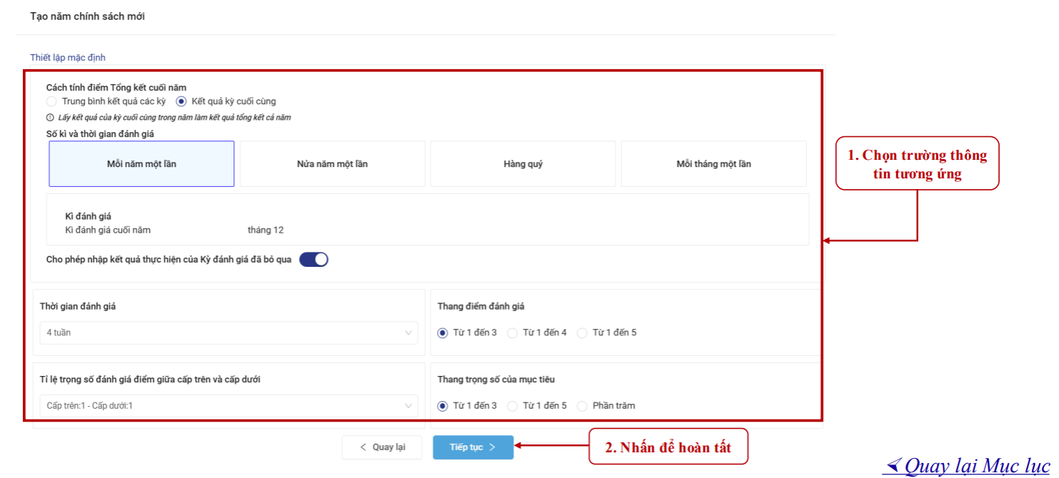 Quản lý Nhân sự cần "Thiết lập kỳ đánh giá" với các nội dung lần lượt bên dưới, tương tự thao tác ở phần đầu kích hoạt tài khoản công ty. Xem diễn giải chi tiết bên dưới: