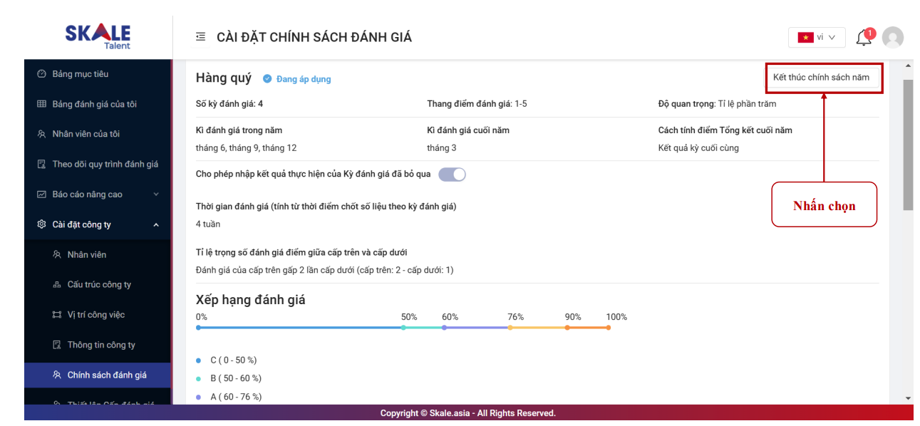 Sau khi kích hoạt thành công chính sách năm mới, Quản lý Nhân sự thực hiện "Kết thúc chính sách năm" cũ để đảm bảo hệ thống áp dụng đúng kỳ đánh giá hiện hành.